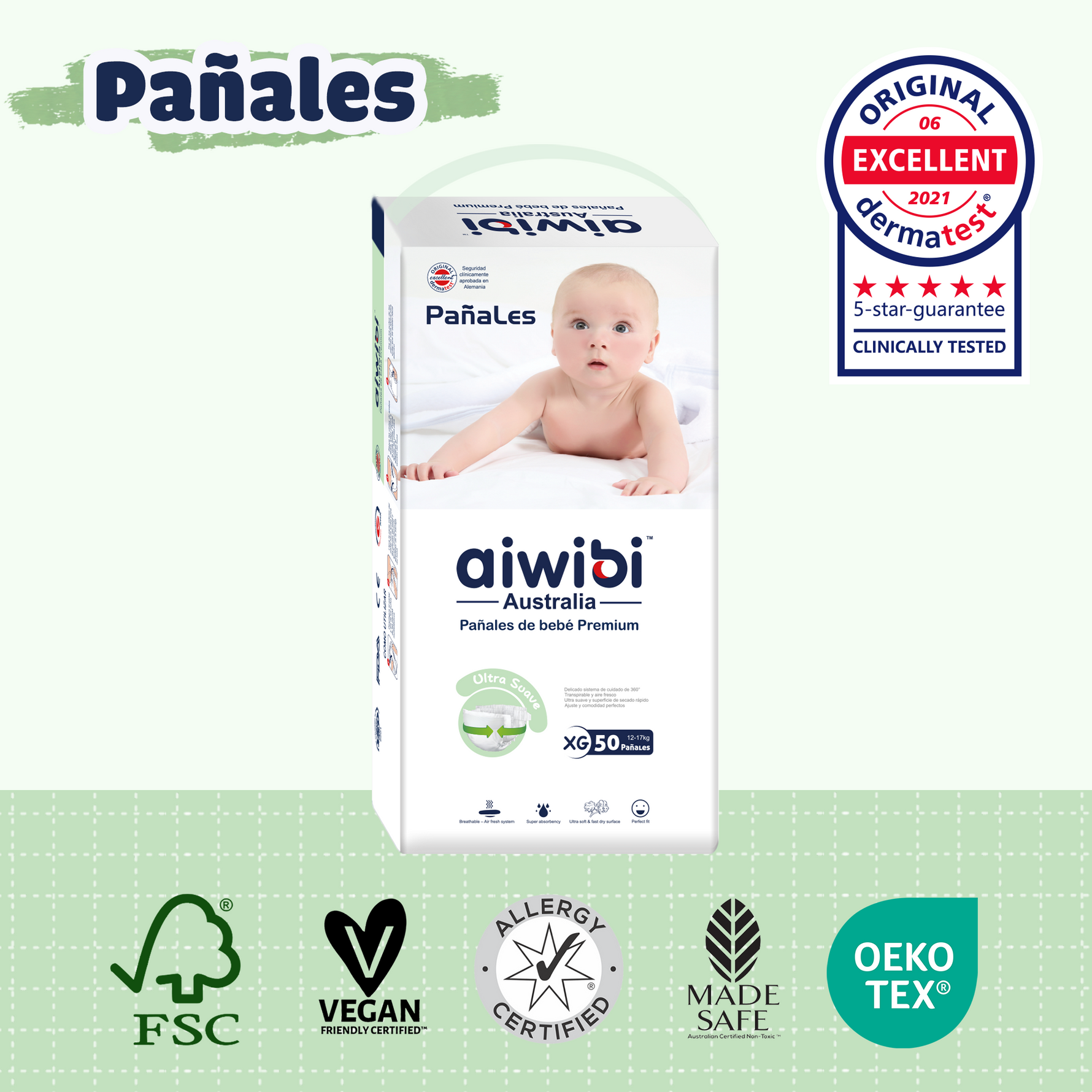 - Los pañales Aiwibi están certificados por el Instituto Dermatológico Alemán Dermatest, lo que garantiza su suavidad con la piel de tu bebé. No añadimos fragancias, extractos, colorantes ni otros productos químicos agresivos, lo que los hace inodoros e hipoalergénicos.