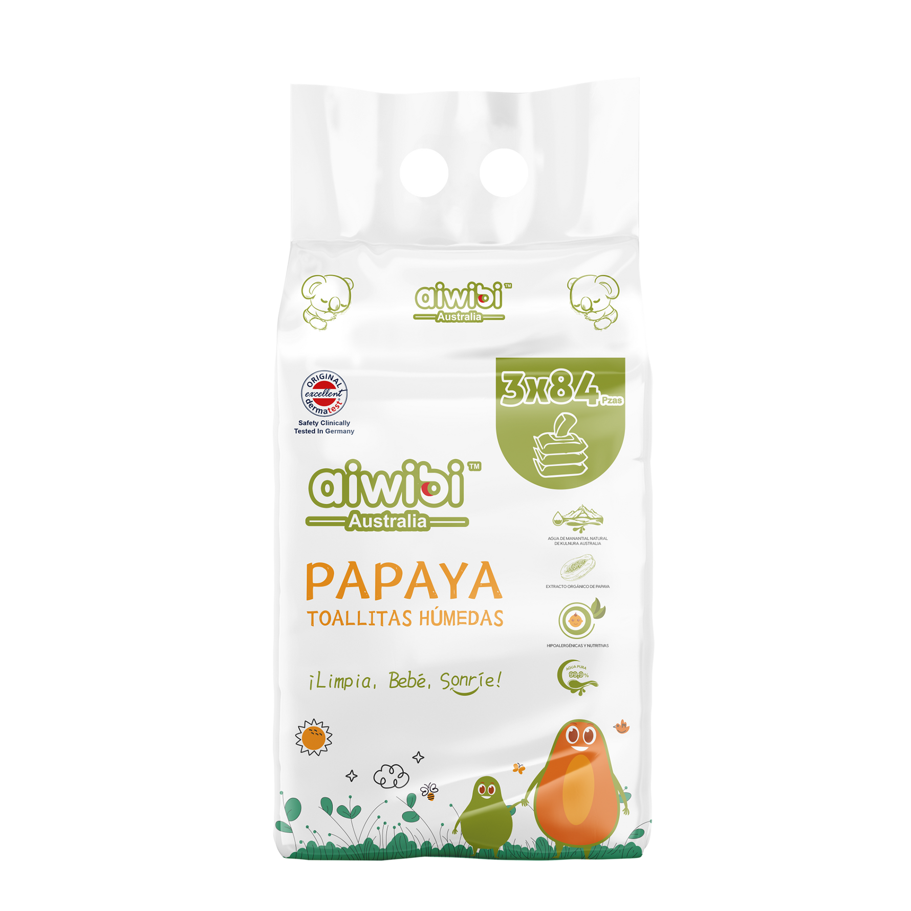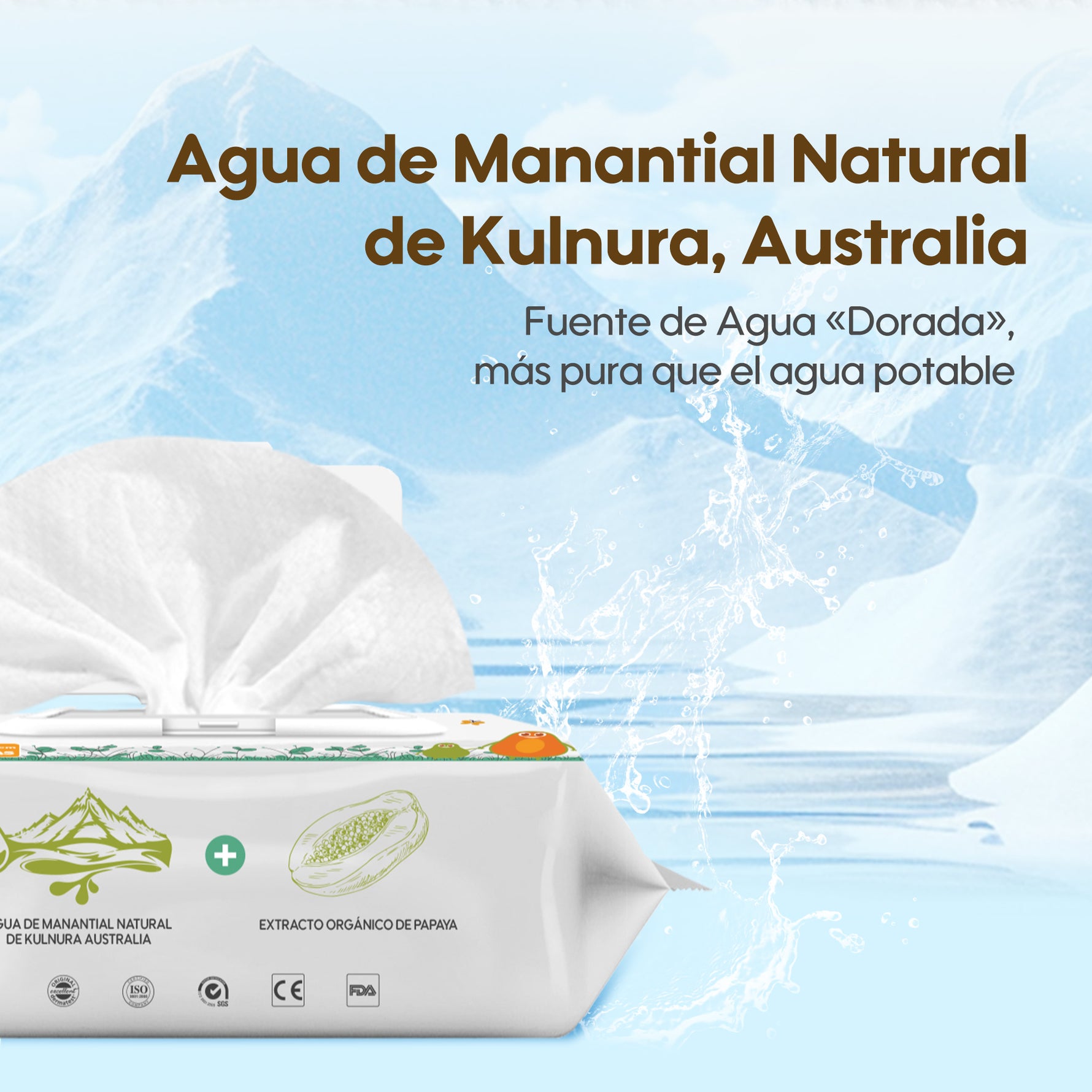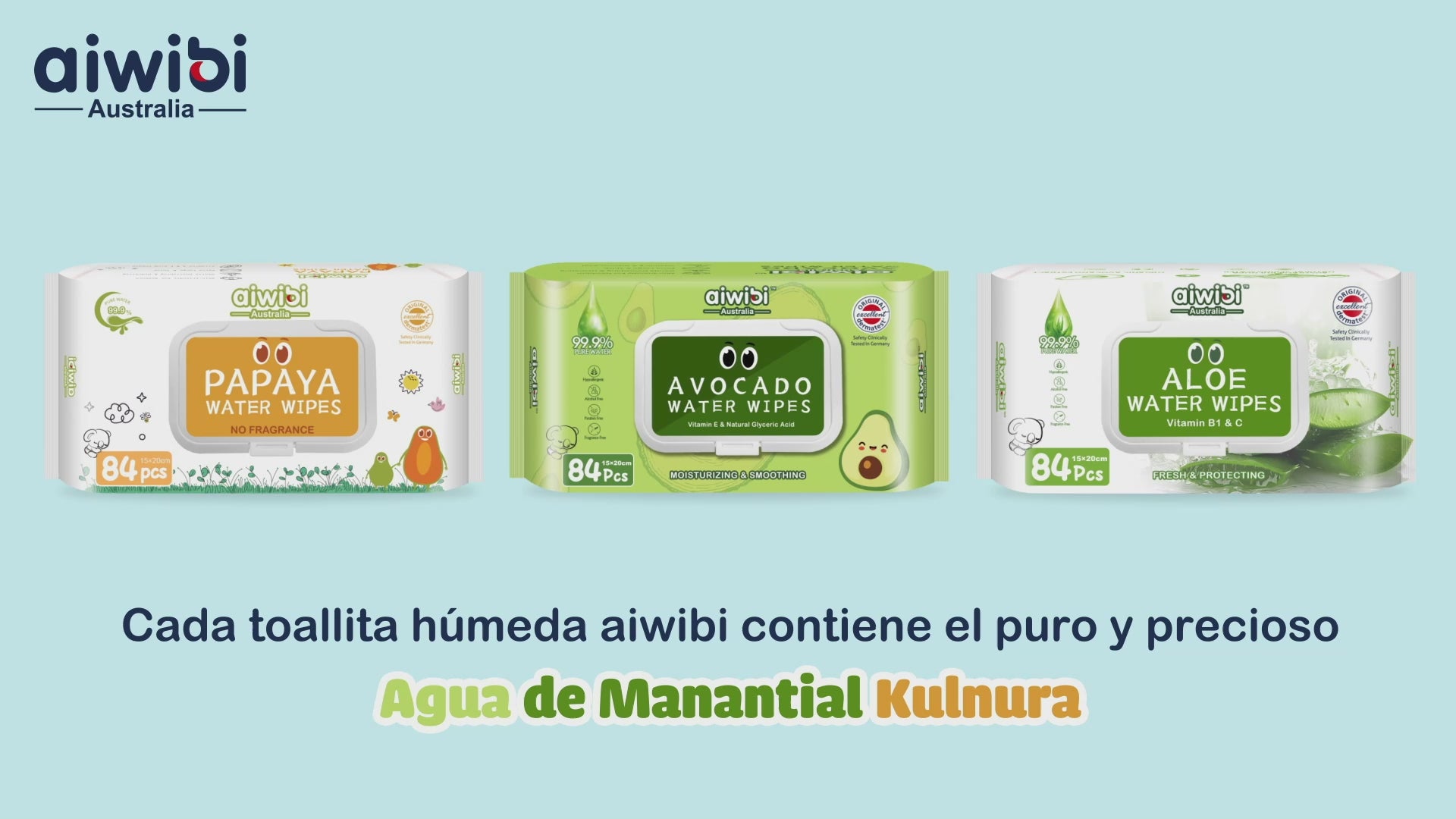 Precio unitario porMostrando la colección de toallitas húmedas fresh, que utilizan agua del manantial Kulnura. El koala explica que se trata de su ingrediente principal, con propiedades limpiadoras e hidratantes.