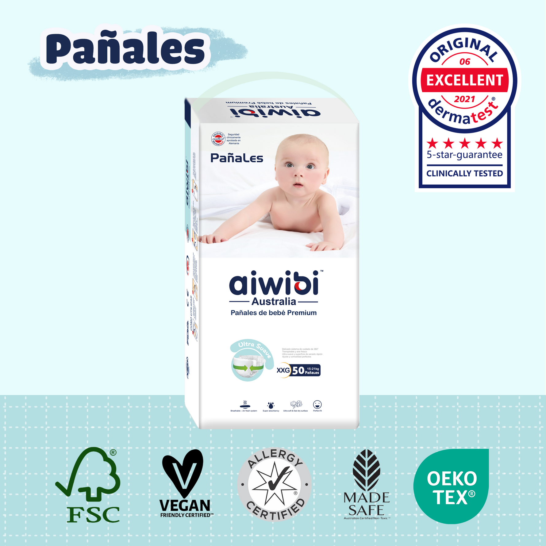 - Los pañales Aiwibi están certificados por el Instituto Dermatológico Alemán Dermatest, lo que garantiza su suavidad con la piel de tu bebé. No añadimos fragancias, extractos, colorantes ni otros productos químicos agresivos, lo que los hace inodoros e hipoalergénicos.